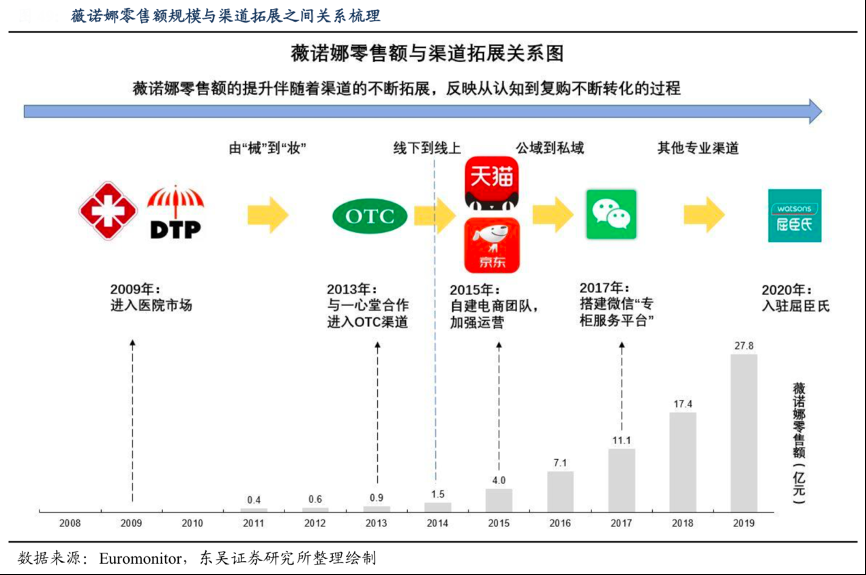 經典案例:根據Euromonitor、東吳證券研究所等綜合資訊表明,縱觀薇諾娜零售額的 每一次飛躍,均伴隨著渠道的進一步拓展:2013年,為實施由“械”到“妝”的發展 戰略,其由銷售“械字號”產品的醫院渠道進入可銷售“妝字號”產品的OTC 藥店渠道;2015年,為搶占電商發展紅利,其自建電商團隊,加強線上運營;2020年,其入駐屈臣氏渠道、開設線下體驗店,嘗試其他有利于維護專業品牌形象的渠道。