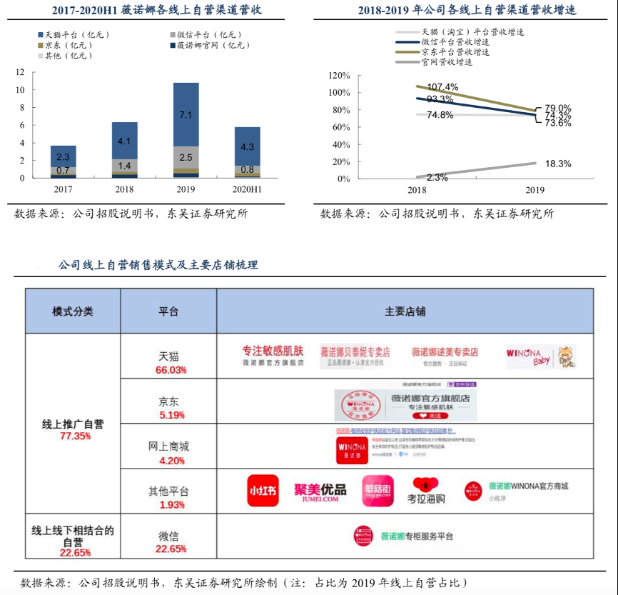 經典案例:根據公司招股說明書、東吳證券研究所等綜合資訊表明,Euromonitor公司自營電商主要由天貓淘寶平臺、微信平臺、京東、薇諾娜官網等組成。其中,2019年公司通過天貓平臺和微信平臺分別實現營收 7.1/2.5 億元,兩者占自營電商比例合計為 90%。2019 年公司自營電商整體營 收增速為 71.11%,其中天貓(淘寶)平臺/微信平臺/京東增速均較快,增速分別為 73.6%/74.3%/79.0%。