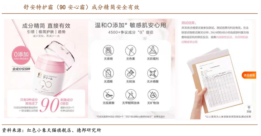 經(jīng)典案例:根據(jù)紅色小象天貓旗艦店、德邦研究所等綜合資訊表明,紅色小象品牌致力于使用基于技術(shù)的無(wú)添加劑天然成分,明星產(chǎn)品舒安特護(hù)霜(90安心霜)為例,8種經(jīng)典基礎(chǔ)原料(如巴西菊樹(shù)樹(shù)皮)+1 款提純的天然紅沒(méi)藥醇,“9”種成分將精簡(jiǎn)做到極致,同時(shí)滿足舒緩、保濕、維穩(wěn)功效;無(wú)香精、無(wú)防腐劑、無(wú)硅油、無(wú)酒精等,“0”添加 4500 余種“2021 版法規(guī) inci 美修安全分”中的爭(zhēng)議成分,力保產(chǎn)品的溫和安全,真正通過(guò)成分的添加及復(fù)配研究,實(shí)現(xiàn)安全與功效的雙重保障。