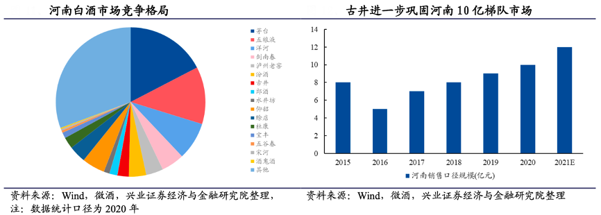 經典案例:根據wind、徽酒、興業證券經濟與金融研究院等綜合資訊表明,古井 2010 年便開始布局河南市場,先后主打 40-45 元老玻貢、古井獻禮版、古井幸福版等,產品以中低端為主,銷售起勢后提出打造第二個安徽市場的口號。但由于產品中低端定位及銷售管控不足,短期銷售規模下滑明顯。2018年其開始轉變思路,主打古7/古 8 中國香、古 20 等高價位產品,同時在河南進行了人事調整和渠道下沉,復制“三通工程”實行深度分銷,逐步形成以鄭州為中心的板塊市場,以點帶面打開增長空間,最終拿下周口、商丘、開封等地區市場。