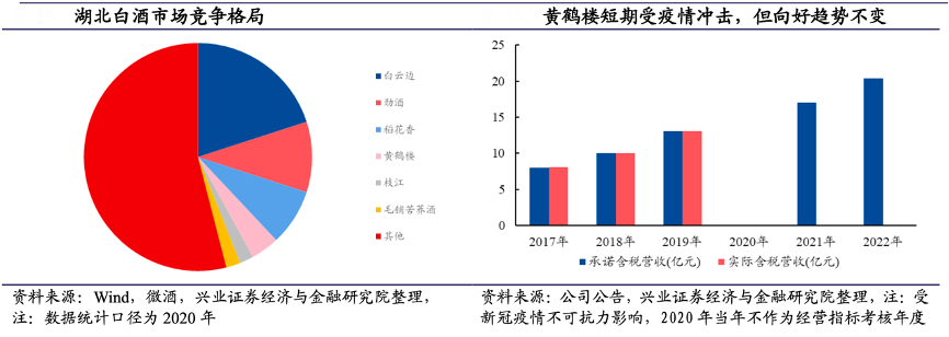 經典案例:根據wind、徽酒、公司公告、興業證券經濟與金融研究院等綜合資訊表明,2016年古井正式收購當地名酒企業黃鶴樓 51%的股權,并對黃鶴樓酒業的營銷管理進行了一系列的整合和調整,以期快速提高湖北市場占有率。從競爭格局來看,黃鶴樓為老十三大名酒、湖北區域性品牌,處于第二梯隊,具備后發優勢。