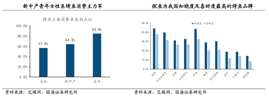 經典案例:根據艾媒網、國海證券研究所等綜合資訊表明,結合餐飲界調查數據,女性/新中產/青年在烤魚消費者中分別占比 57%/64%/85%,消費體驗較為重要。探魚成立于 2013 年,第一家店在深圳南山區海岸城開業,通過宣傳“深圳最文藝烤魚店”在早期建立品牌力。探魚采用直營為主、加盟為輔的拓 店策略,首創鮮青椒烤魚口味引發行業效仿,目前“探魚”系烤魚賽道中消費者最為關注知曉度及喜好度最高的品牌。