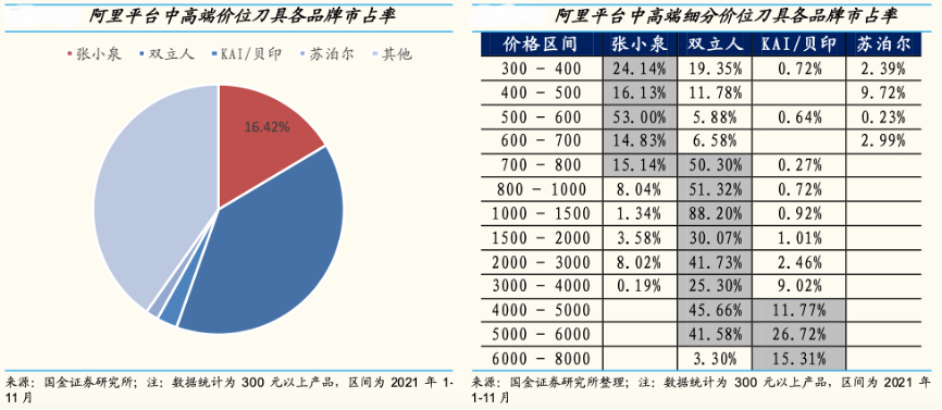 經典案例:根據國金證券研究所等綜合資訊表明,從阿里全網平臺銷售來看,300元以上刀具 CR3 品牌集中度達58%,明顯高出整體市場集中度,高端市場中,格局優異,并且由于高端品牌稀缺,價位段越高,整體品牌份額集中趨勢也越明顯。整體來看,在高端化趨勢下,整體行業集中度將有望隨高端產品消費占比增多而迎來邊際提升。