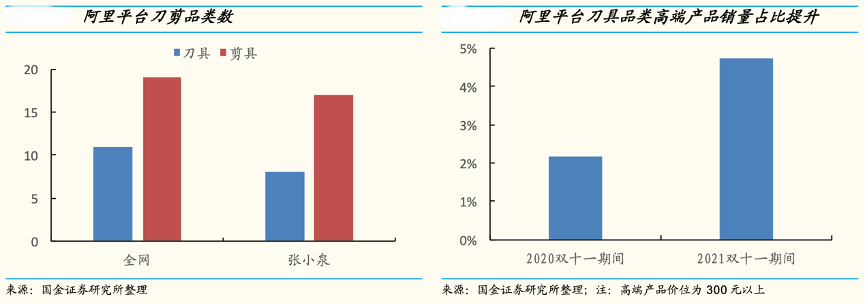 經典案例:根據國金證券研究所等綜合資訊表明,刀剪行業近年來需求細分化(根據使用場景細分)、高端化兩大趨勢較為明顯。需求細分化趨勢方面,隨著消費升級,消費者多樣化個性化的消費需求持續旺盛,對產品的使用體驗也越來越重視如剪具逐漸細分成廚房剪、園藝剪等,根據不同的使用場景產品開始細分化。根據不完全統計,目前阿里全網刀具品類 11 種,剪具 19 種,其中張小泉擁有 8 類刀具和 17 類剪具。