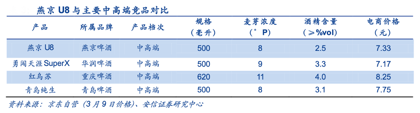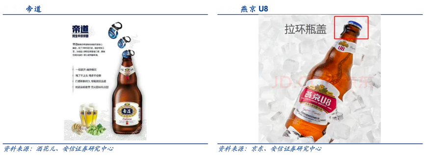 經典案例:根據酒花兒、京東、安信證券研究中心等綜合資訊表明,自 2013 年首度推出中高端產品燕京原漿白啤后,燕京啤酒公司于 2018 年上半年推出中高端啤酒燕京帝道,以“低度不上頭”的定位和拉環瓶蓋的新包裝打入年輕消費者群體。其于 2019 年再度推出燕京 U8 以站穩中高端市場,通過燕京 U8 的差異化定位參與中高端市場的競爭。