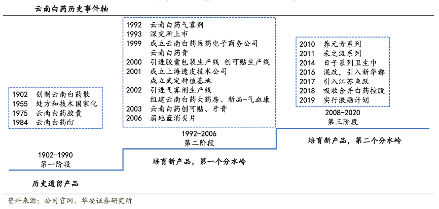 經(jīng)典案例:根據(jù)公司官網(wǎng)、華安證券研究所等綜合資訊表明,云南白藥,原名“萬應(yīng)百寶丹”,于 1902 年由云南民間名醫(yī)曲煥章創(chuàng)制,擁有 國家機密級配方,受到永久性保護。云南白藥集團股份有限公司前身是 1971 年建 立的云南白藥廠,1993 年在深交所掛牌上市,成為云南省首家上市公司。其主要經(jīng)營涉及化學(xué)原料藥、化學(xué)藥制劑、中成藥和中藥材等,擁有云南白藥散劑和云南 白藥膠囊兩個國家一級中藥保護品種,以事業(yè)部的形式,按照產(chǎn)品系列及服務(wù)劃分 四大業(yè)務(wù)板塊,較早實施多元化戰(zhàn)略。