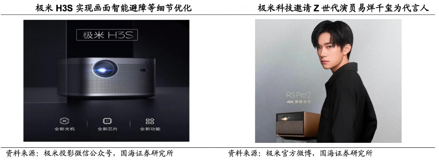 經(jīng)典案例:根據(jù)極米投影微信公眾號、極米官方微博、國海證券研究所等綜合資訊表明,極米引領(lǐng)行業(yè)實(shí)現(xiàn)投影由手動(dòng)調(diào)焦到自動(dòng)調(diào)焦,再到全自動(dòng)調(diào)焦的轉(zhuǎn)變,現(xiàn)階段注重光學(xué)引擎、無感知、幕布對齊、自動(dòng)避障等細(xì)節(jié)宣傳,新品多領(lǐng)先于同類公司發(fā)布,在注重科技感的 Z 世代心中具有先發(fā)優(yōu)勢;同時(shí)其邀請新生代演員易烊千璽進(jìn)行代言,陽光外形與極米投影儀高顏值相得益彰,實(shí)力派演技與極米技術(shù)優(yōu)勢不謀而合,為 Z 世代傳遞滿滿正能量。