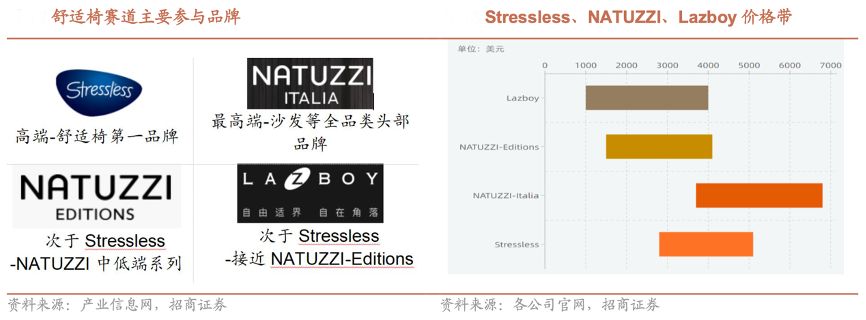 經(jīng)典案例:根據(jù)產(chǎn)業(yè)信息網(wǎng)、各公司官網(wǎng)、招商證券等綜合資訊表明, NATUZZI-Italia 定位最高端,是沙發(fā)等全品類的頭部品牌,價格帶最高,在 3700-6800 美元,定價比 Stressless 高 25~30%,但 NATUZZI 品牌產(chǎn)品品類更加豐富,最開始做沙發(fā)品類起家,在舒適椅領(lǐng)域積累不及 Stressless。 Lazboy 單椅品類較為突出,品牌定位及價格接近 NATUZZI-Editions,價格帶在 1000-4000 美元之間。
