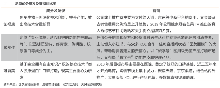 經典案例:根據創爾生物招股書、魔鏡市場情報、億邦動力網、天風證券研究所等綜合資訊表明,目前,醫美及相關行業主要品牌的營銷以硬核研發實力為立足點,基于微博、小紅書、抖音等社交平臺的文章推送、筆記分析、短視頻推薦的多元內容營銷成為主流。同時,“醫美用”定位為品牌帶來專業形象,注入活力,被植入醫美概念的消費者對產品開始具有功能性需求,探索更多醫美護膚內容,全渠道經營日益成為行業標配。