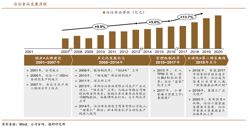 經典案例:根據wind、公司官網、德邦研究院等綜合資訊表明,洽洽食品主要生產堅果炒貨類、焙烤類休閑食品,經過多年的發展,其憑借穩定原料基地優勢和產品質量優勢,深受消費者的喜愛,品牌知名度和美譽度不斷提升,是中國堅果炒貨行業的領軍品牌,產品遠銷國內外 40 多個國家和地區,擁有較高的知名度和市場影響力。