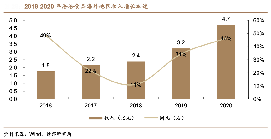 經典案例:根據wind、德邦研究院等綜合資訊表明,目前洽洽食品公司掌握約 40 萬個終端,紅袋瓜子在一二線等高線城市的滲透率達到 60~70%,而在低線城市滲透率僅為30%左右,下沉市場仍大有可為。在渠道拓展策略上,公司通過“百萬終端戰略”提高終端覆蓋度,并加大電商、新零售等新渠道的開發,進行全渠道發展。全年海外實現收入 4.71 億元,同比高增 46.39%, 2016-2020 年復合增速達 28%,海外市場已成為公司新的增長點。