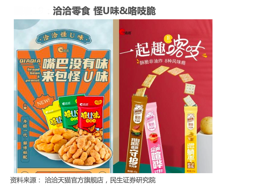 經典案例:根據洽洽天貓官方旗艦店、民生證券研究院等綜合資訊表明,2020年洽洽食品零食實現6.14億元收入,8年CAGR+0.99%。對于休閑食品,其已成立單獨休閑食品板塊,以“品類合伙人”方式進行推廣。目前更加聚焦城市和客戶,打造出樣板市場 后,繼續復制現有優勢。同時在客群上,其零食的受眾更集中于年輕人,將在抖音等新媒體渠道發力。