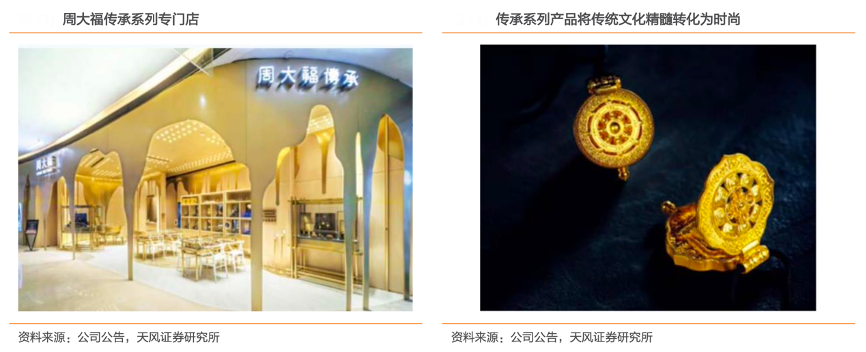 經(jīng)典案例:根據(jù)公司公告、天風證券研究所等綜合資訊表明,2018 年,周大福傳承系列在蘇州博物館正式發(fā)布推出,首次嘗試以“國潮”形象跨界幾大潮牌,傳承系列突出文化、傳承和現(xiàn)代美學自然平衡之美,取得了極好的市場反應。2019財年,其黃金產(chǎn)品的平均售價上升 13.2%,而周大福傳承系列的成功在其中發(fā)揮了一定的作用,2020 財年與 2021 財年,傳承系列在公司內(nèi)地市場黃金產(chǎn)品零售值 占比分別達32.2%/39.5%。