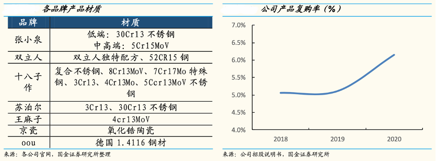 優異的產品品質也使得張小泉百年以來的“良鋼精作”品牌形象堅實樹立在消 費者心中。逐年攀升的復購率也印證了這點,復購率從 2018 年的 5.1%攀升至 2020 年的 6.2%。