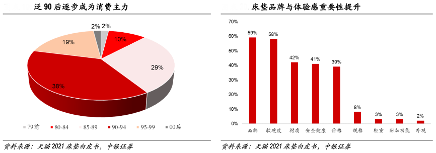 經典案例:根據天貓2021床墊白皮書、中銀證券等綜合資訊表明,隨著泛 90 后逐步成為消費主力,消費者對產品關注的重心發生轉移,顏值、品牌、軟硬度替代價格和材質成為消費者購買沙發和床墊等軟體家居的首要考量因素,反映出了消費者關注重心逐步從性價比轉移到品牌與體驗感,消費品年輕化趨勢顯現。