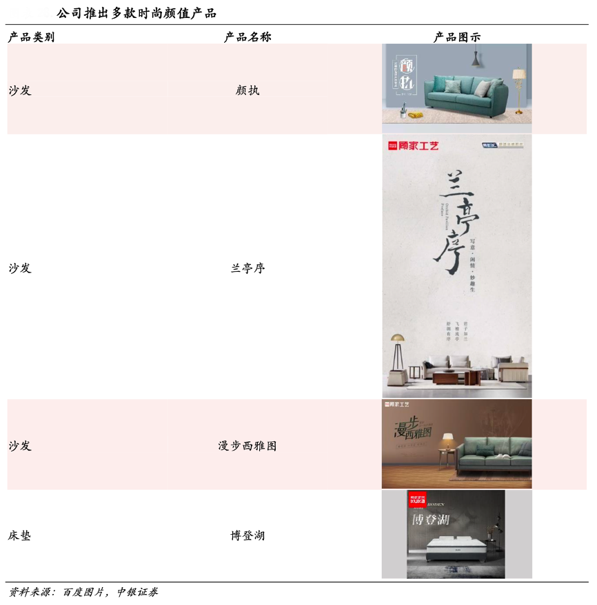 經典案例:根據百度圖片、中銀證券等綜合資訊表明,在產品端,顧家家居公司結合了年輕化設計理念,先后推出了“顏執”、“蘭亭序”、“漫步西雅圖”、“博登湖床墊”等多款顏值與舒適性俱佳的軟體家居產品,在傳統功能基礎上突出文藝、個性及自由等時尚元素,更容易與年輕消費群體產生共鳴。2020年4月顧家家居公司推出時尚品牌“天禧派”,聚焦年輕消費群體。