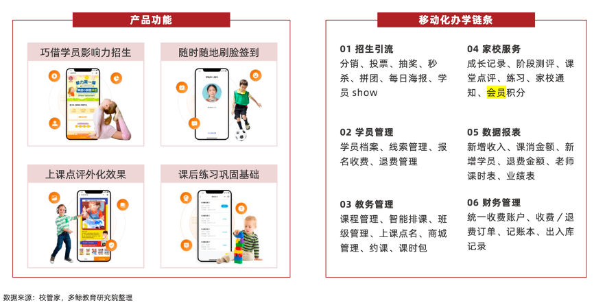 經(jīng)典案例:根據(jù)校管家、多鯨教育研究院等綜合資訊表明,面對(duì)機(jī)構(gòu)轉(zhuǎn)型難題,校管家旗下產(chǎn)品“校管家云校”為素質(zhì)教育機(jī)構(gòu)提供了移動(dòng)化便捷服務(wù)。基于校管家 11 年服務(wù)全國(guó)中大型規(guī)模教育機(jī)構(gòu)積累的運(yùn)營(yíng)管理經(jīng)驗(yàn),校管家云校提煉了包括招生引流、學(xué)員管理、教務(wù)管理、家校服務(wù)、數(shù)據(jù)報(bào)表、財(cái)務(wù)管理 6 大流程在內(nèi)的辦學(xué)經(jīng)營(yíng)鏈路,以解決機(jī)構(gòu)的經(jīng)營(yíng)管理難題,減輕老師的非教學(xué)工作負(fù)擔(dān)。
