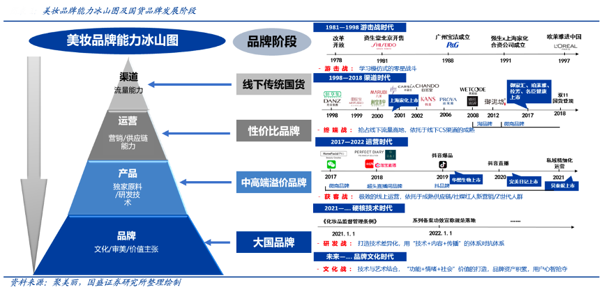 經典案例:根據聚美麗、國盛證券研究所等綜合資訊表明,回顧中國化妝品市場發展史,行業競爭要素逐漸沿著“渠道—運營—產品—品牌”演進,國貨品牌則從淺入深向歷史悠久的海外品牌學習趕超,從搭建“產品技術+渠道觸達+營銷內容”體系的硬實力,再逐漸上升到品牌整體“審美+設計+文化”的軟實力。