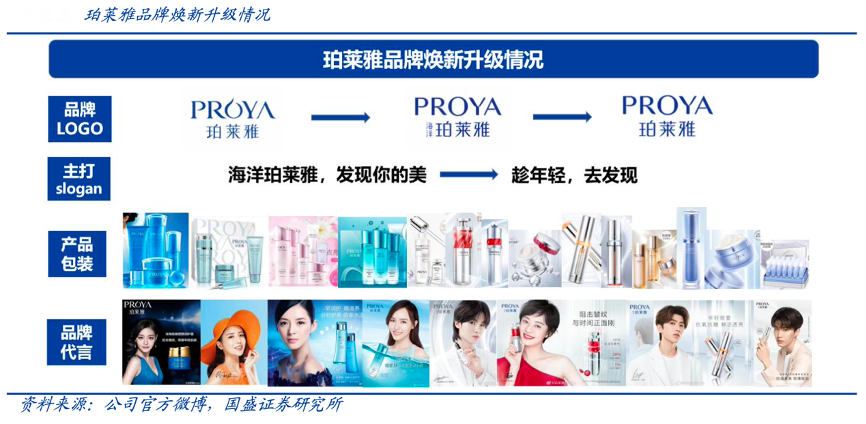 經典案例:根據公司官方微博、國盛證券研究所等綜合資訊表明,珀萊雅高度重視品牌建設, 2018-2021H1 形象宣傳推廣費率分別達21.2%/26.9%/32.7%/34.0%。從外在展示到產品內容全方位升級,一方面使品牌調性更貼近年輕化消費者,如主打 slogan 變為“趁年輕,去發現”,所選取代言人兼具流量與圈層,針對面膜/精華/彩妝 等不同系列產品線靈活選取不同年齡段的明星助力推廣;另一方面則使品牌調性更具科 技感,如產品包裝更為簡約大方,突出核心成分及主打功能。