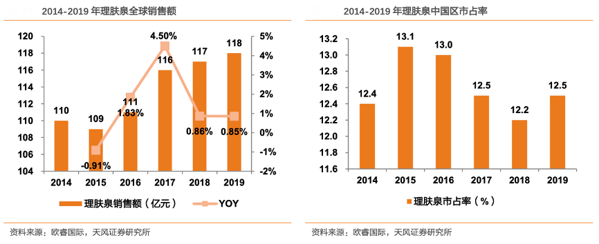 經典案例:根據歐睿國際、天風證券研究所等綜合資訊表明,結合歐睿咨詢統計,2014-2019年理膚泉全球銷售額年復合增長率1.4%,2019年理膚泉品牌全球銷售額達118億元,同比增0.85%。其中理膚泉在中國區市場占比12.5%。僅次于薇諾娜、雅漾。其以敏感肌為目標人群,找準剛需市場,更易完成現有流量變現。