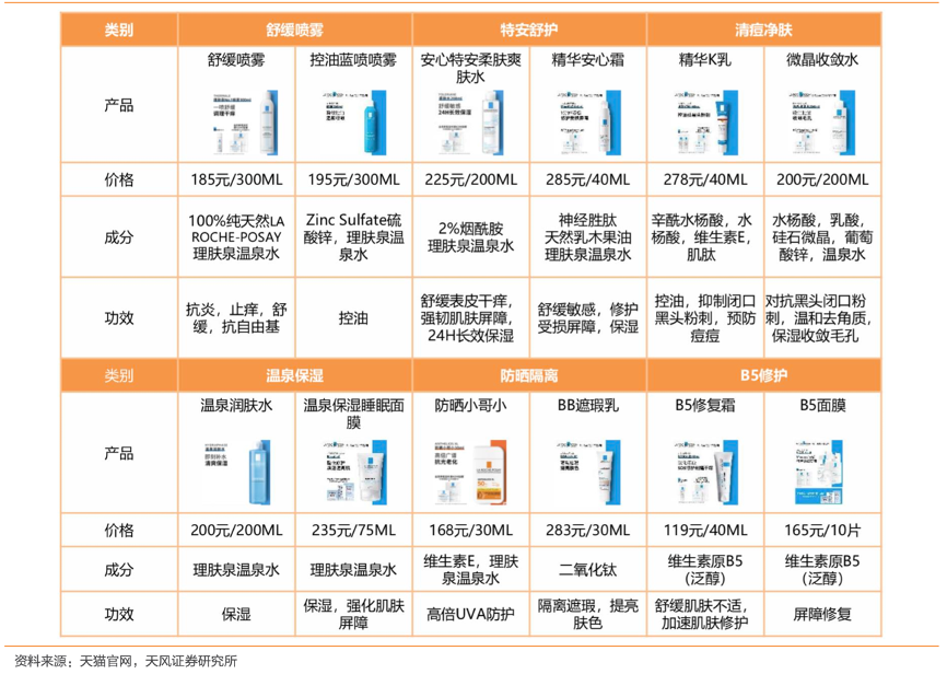 經典案例:根據天貓官網、天風證券研究所等綜合資訊表明,理膚泉產品分為以下六個系列:1)舒緩噴霧:補水、保濕、舒緩噴霧;2)特安舒護:保濕、舒緩肌膚、修護;3)清痘凈膚:修護、滋養、舒緩修護;4)溫泉保濕:補水、保濕、水潤清透;5)防曬隔離:補水、防曬、隔離、清爽;6)營潤身體:保濕、滋潤、修護、滋養肌膚。其產品生產嚴格遵循 GMP 標準,包裝無菌安全。