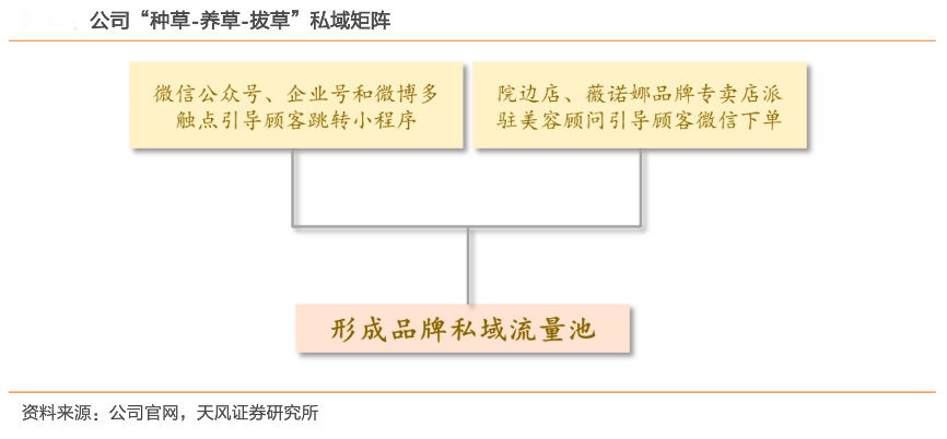 經典案例:根據公司官網、天風證券研究所等綜合資訊表明,薇諾娜整合線上、線下渠道優勢,從線下看,其通過其駐有 BA 的院邊店和數量龐大的藥房終端,將客流轉化為線上私域流量。從線上看,薇諾娜通過微信、微博進行義診和專業化的產品教育,吸引粉絲關注,從線上渠道積攢私域流量。