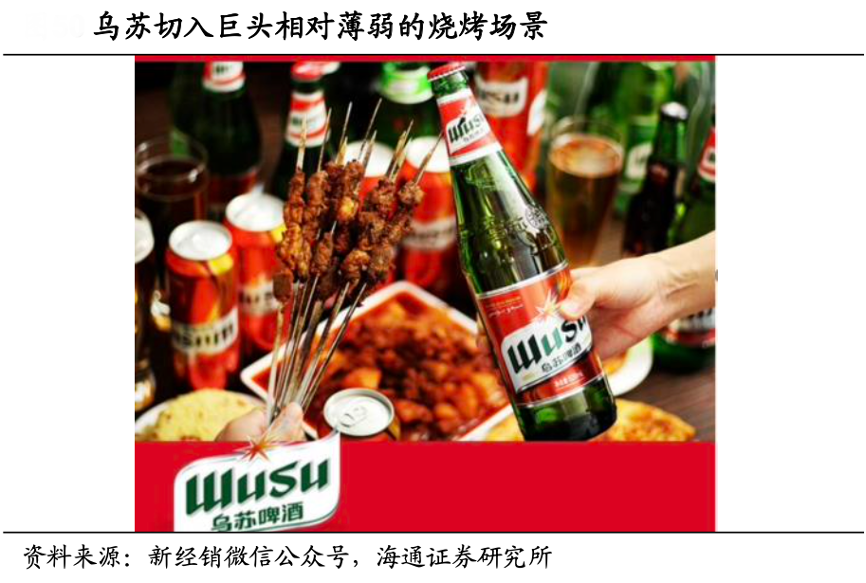 經典案例:根據新經銷微信公眾號、海通證券研究所等綜合資訊表明,烏蘇以國內龍頭公司難以覆蓋的燒烤店為突破口,在疆外 30 個大中城市覆蓋了有合作關系的 2.6 萬個燒烤店,另外,較高的渠道利潤推升了商家的積極性,使得烏蘇在渠道推力持續強化,一些其他啤酒品牌的經銷商也開始主動進貨并向下游推薦。