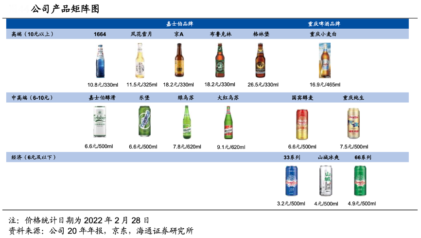 經典案例:根據公司20年年報、京東、海通證券研究所等綜合資訊表明,重慶品牌,其推進產品高端化,通過國賓醇麥、重慶純生推進品牌高端化,推出重慶無醇啤酒,創新產品品類和飲用場景。其針對山城啤 酒持續投入,推出經典拉罐包裝新品,復刻上世紀的經典山城瓶標,受到消費者歡迎。2020年重慶地區山城啤酒銷量止跌回升,21H1銷量持續增長。