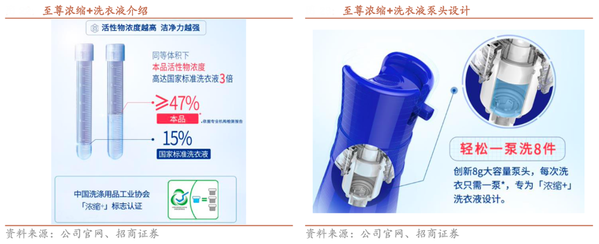 經典案例:根據公司官網、招商證券等綜合資訊表明,藍月亮公司在普通洗衣液、濃縮洗衣液和洗衣助劑領域有完整布局,在 1993 年藍月亮品牌創 立之初就推出了衣領凈產品,在 2008 年推出的深層潔凈護理洗衣液,在2015 年推出至尊濃縮+洗衣液。至尊濃縮+洗衣液活性物濃度高達 47%,獲得中國洗協“濃縮+”標志認證,與國家標準洗衣液相比用量可減少 82.5%,在包裝瓶設計上更為人性化、便利化,精準量取、噴嘴干凈并且減少瓶內余液量,利用技術打造產品,改善用戶體驗。