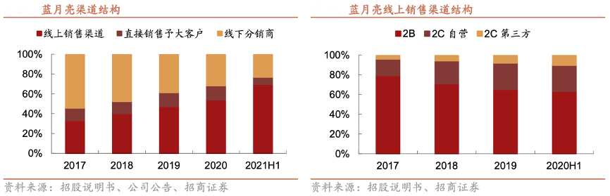 經典案例:根據招股說明書、公司公告、招商證券等綜合資訊表明,藍月亮公司銷售渠道包括線上渠道、KA 渠道和分銷商渠道。其在 2012 年 7 月開設天 貓旗艦店打開線上渠道,2015 年 8 月通過微信進行銷售,是最早布局電商的家清品牌之一。作為線上渠道領先者,其充分享受到中國的電商紅利,線上渠道收入貢獻增長迅速,2017-2020 年線上渠道收入 CAGR 達 26.5%。