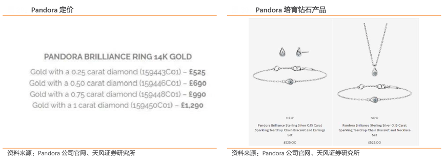 經(jīng)典案例:根據(jù)Pandora公司官網(wǎng)、天風(fēng)證券研究所等綜合資訊表明,Pandora 對于培育鉆石在終端市場的定位和Lightbox 十分相似,即“時尚珠寶”,與天然鉆石所代表的“高端、奢侈、稀缺、恒久”形成了較大對比。其產(chǎn)品售價格也較低,目前大致在 900 美元/0.5 克拉左右,“低價” “時尚”的產(chǎn)品定位有助于其精確瞄準(zhǔn)受眾群體。