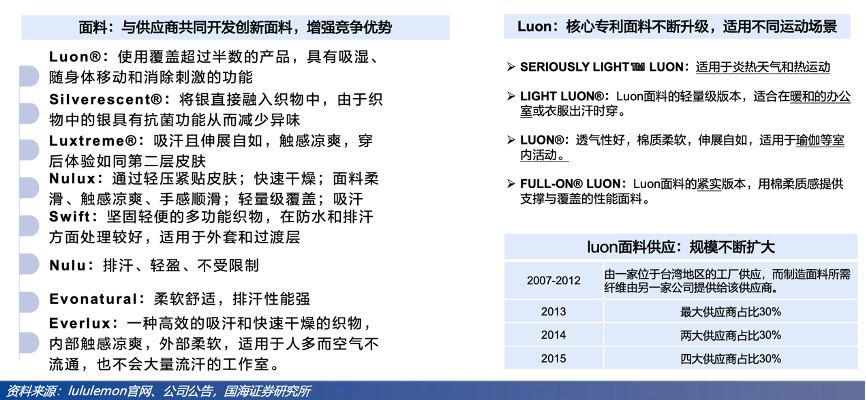 經典案例:根據LuLuLemon官網、公司公告、國海證券研究所等綜合資訊表明,Lululemon以出色的面料聞名,Luon面料正是將Chip Wilson變成“King of Luon”的王牌面料,有一段時間75%的收入來自于該種面料制成的產品。