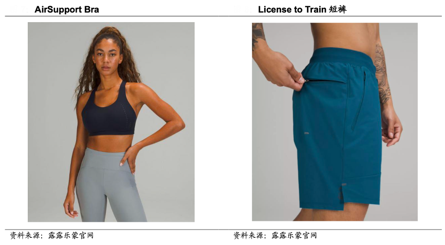 經(jīng)典案例:根據(jù)露露樂蒙官網(wǎng)、國海證券研究所等綜合資訊表明,2021年,露露樂蒙公司推出由 SmoothCover 面料制成的 Instill 來擴(kuò)展瑜伽產(chǎn)品。歷經(jīng)約兩年制作,SmoothCover 面料具有優(yōu)秀的穩(wěn)定支撐性能。新推出的AirSupport Bra 是迄今為止經(jīng)過最嚴(yán)格 測試的文胸,花費(fèi)五年時(shí)間研發(fā),在高支撐性和舒適性方面取得突破,并且光滑 的 Ultralu 面料增添了柔軟度。男士業(yè)務(wù)方面,其亦有新品布局夏日場景,推出多功能 License to Train 短褲,由 High Impact Swift Pique 面料制成,面料排汗干爽,不易破損。
