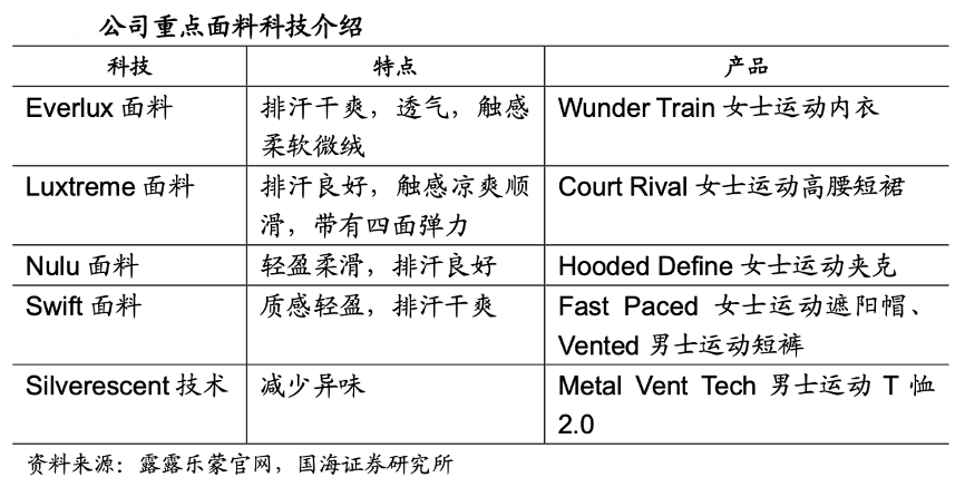 經(jīng)典案例:根據(jù)露露樂蒙官網(wǎng)、國海證券研究所等綜合資訊表明,露露樂蒙公司將多種面料科技運用至新產(chǎn)品上,新產(chǎn)品使用輕彈面料,有效提升動能和靈活度。例如,CourtCrush 女士網(wǎng)球連衣裙采用Everlux面料,透氣排汗,外側(cè)觸感柔軟,內(nèi)側(cè)清爽順滑,帶有四面彈力,助力穿著者暢意運動。