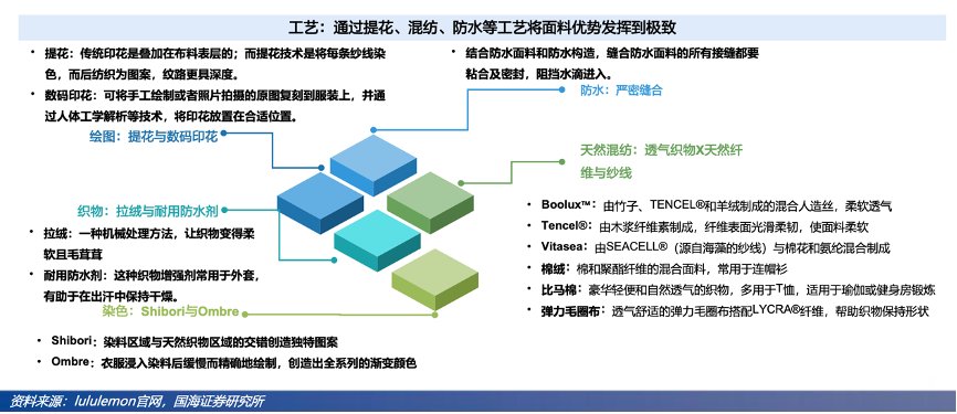 經(jīng)典案例:根據(jù)Lululemon官網(wǎng)、國海證券研究所等綜合資訊表明,Lululemon采用“感觸科學”的設(shè)計理念,因穿著感受決定運動表現(xiàn)。因為感覺良好時,運動者腦中不再有其他雜念,才會壓得更低、保持更久、抬得更高來抵達自己原有的極限。Lululemon的設(shè)計理念是在最需要的關(guān)鍵部位提供完美支撐,而其他部位則自由無舒服,這樣的穿著感通過兩種不同構(gòu)造來打造。
