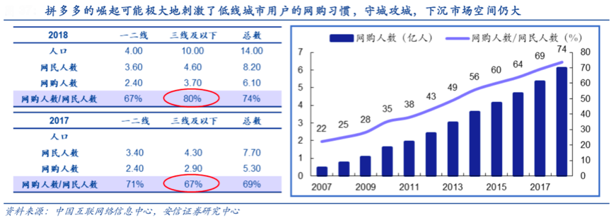 三四線市場用戶有自己的消費習慣,有自己的消費特色,這是企業經營三四線市場品牌營銷策劃時需要重點關注的。據中國互聯網絡信息中心、安信證券研究中心等綜合資訊表明,在拼多多現有用戶中,其已基本完成了三線及以下網購用戶的覆蓋;另一方面,我們從以下數據中發現,拼多多的崛起可能極大地刺激了低線城市用戶的網購習慣。