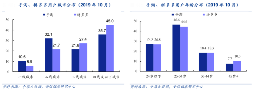 以手淘為代表的大平臺在三四線市場運作中占據“優勢競爭地位”,其依靠平臺的流量優勢、用戶優勢等引領風潮。根據個推大數據、安信證券研究中心等綜合資訊表明,2019年10月,51.4%的手淘用戶為拼多多用戶,78.3%的拼多多用戶為手淘用戶,拼多多用戶 72.4%來自三線及以下城市,而手淘三線及以下城市用戶占比為 57.3%。拼多多一二線客戶占比較低,且阿里系用戶有近半數仍未下載拼多多 APP,拼多多通過百億補貼進一步滲透一二線用戶和手淘用戶仍有較大空間。