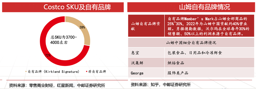 經典案例:根據零售商業財經、紅星新聞、知乎、中郵證券研究所等綜合資訊表明,倉儲會員店奉行“寬SPU、窄SKU”原則,SKU數均在4000個左右。同時Costco、山姆分別主推自有品牌Kirkland Signature和Member’s Mark,為消費者提供更高性價比商品的同時降低自身選品成本。