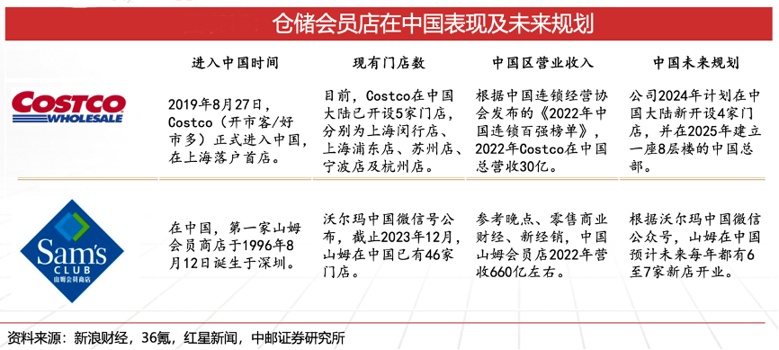 經典案例:根據新浪財經、36氪、紅星新聞、中郵證券研究所等綜合資訊表明,中國成為倉儲會員店龍頭新增長極,Costco和山姆紛紛加碼中國區布局。山姆于 1996年進入中國,發展至今有46家門店,經歷和盒馬的價格戰后未來將繼續加大力度布局中國市場。