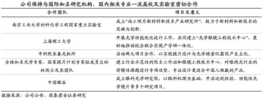 經(jīng)典案例:根據(jù)公司公告、國(guó)泰君安證券研究等綜合資訊表明,明月鏡片公司重視技術(shù)及產(chǎn)品的研發(fā),設(shè)立研發(fā)中心并制定一套完整的研發(fā)業(yè)務(wù)流程及科研項(xiàng)目管理流程,組建一支技術(shù)水平過(guò)硬、行業(yè)經(jīng)驗(yàn)豐富的技術(shù)研發(fā)團(tuán)隊(duì)。為研發(fā)更符合中國(guó)人眼球結(jié)構(gòu)和用眼習(xí)慣的產(chǎn)品,公司長(zhǎng)期保持與國(guó)際知名研究機(jī)構(gòu)、國(guó)內(nèi)相關(guān)專業(yè)一流高校及實(shí)驗(yàn)室密切合作。