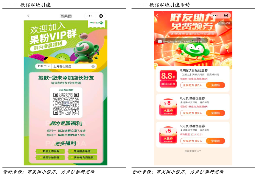 經典案例:根據百果園小程序、方正證券研究所等綜合資訊表明,百果園推出了“到店自提”的運營模式以實現線上線下的流量循環。用戶從 各個觸點接觸到“到店自提”的優惠活動,并下單購買。在用戶到店后,門店工作人員會主動拋出“買水果送回頭券”、“99 元入會”、“進群搶福利”等優惠活動,引導用戶添加企微好友。最后,引導用戶進群,進行欄目化、精細化管理,讓用戶能夠第一時間了解最新產品優惠,促使用戶決策、購買。