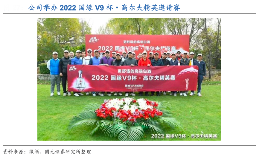 經典案例:根據微酒、國元證券研究所等綜合資訊表明,國緣定位高端,堅持高舉高打。例如, 2022 年 8 月,國緣 V9 與國家高爾夫球隊結成合作伙伴, 同年 11 月舉辦“2022 國緣 V9 杯·高爾夫精英邀請賽”,吸引近 800 位精英人士參 與,在高端消費者圈層展開精準營銷;更在 2023 年末的今世緣發展大會上,公司更是提出了“高端醬酒,獨愛國緣 V9”的鮮明 slogan,并簽約知名演員胡軍成為國緣 V9 代言人。