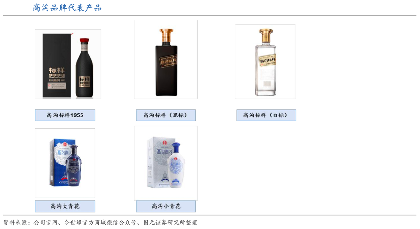 經典案例:根據公司官網、今世緣官方商城微信公眾號、國元證券研究所等綜合資訊表明,高溝品牌2022年品牌重塑后,以新品標樣開啟新征程。公司 2022 年 8 月推出高溝標樣 新品,定位黃淮名酒帶高線光瓶典范,其中高溝標樣 1955 是高端形象產品,黑標、白標為主銷品,兩者中又以黑標為先。