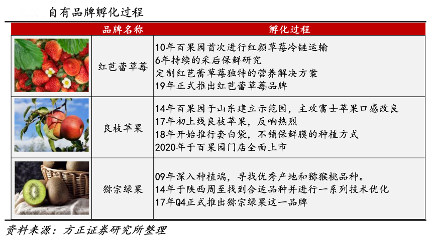 經(jīng)典案例:根據(jù)方正證券研究所等綜合資訊表明,以百果園紅芭蕾草莓、良枝蘋(píng)果、獼宗綠果為例,紅芭蕾歷時(shí)九年,良枝蘋(píng)果歷時(shí)六年,獼宗綠果歷時(shí)八年。百果園深耕水果行業(yè)多年,在種植技術(shù)、品種選取、運(yùn)輸倉(cāng)儲(chǔ)等方面積累了豐富經(jīng)驗(yàn),助力百果園的自有品牌孵化。