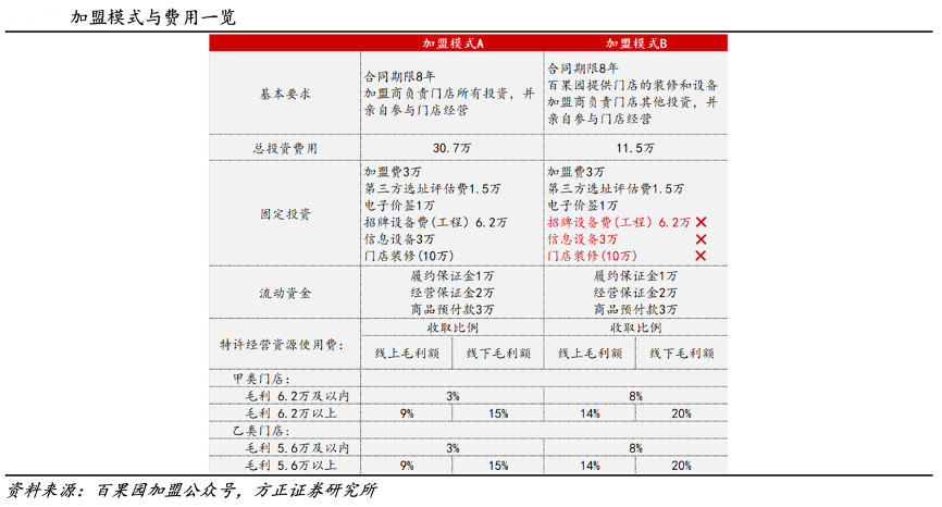 經(jīng)典案例:根據(jù)百果園加盟公眾號(hào)、方正證券研究所等綜合資訊表明,百果園“A+B”雙加盟模式+階梯式收取特許加盟費(fèi)降低加盟商經(jīng)營(yíng)壓力。百果園目前的加盟模式分為 AB 兩種,差異主要在前期投入與后期毛利抽成方面。其中輕資產(chǎn)投入的加盟模式 B 更多提供給老加盟商。抽成方面百果園會(huì)通過(guò)租金、員工薪酬及消費(fèi)能力來(lái)劃分甲、乙兩類門(mén)店,根據(jù)加盟模式按照毛利額階梯式收取特許經(jīng)營(yíng)資源使用費(fèi)。