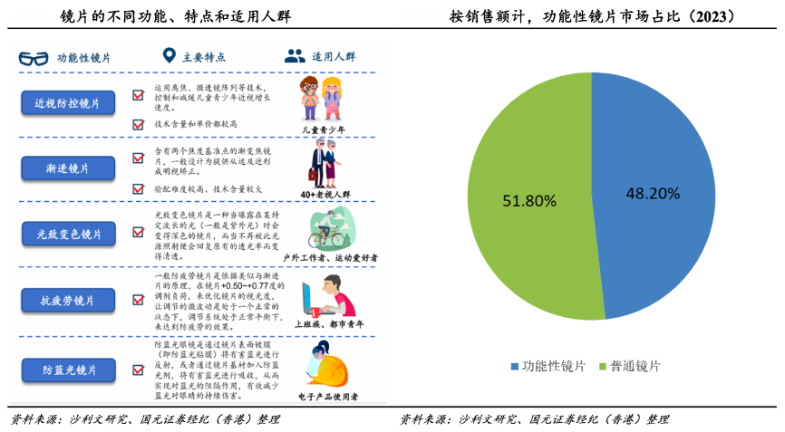 經典案例:根據沙利文研究、國元證券經紀(香港)等綜合資訊表明,功能性鏡片在普通鏡片的基礎上,通過調整材料、配方、設計或膜層,使得鏡片具有近視管理、抗疲勞、防藍光、成人漸進等功能特性,以適應不同的人群和 場合。根據沙利文研究,2023 年功能性鏡片的市場占比為48.2%。目前針對不 同適用人群和使用場景發展出的功能性鏡片包括:近視防控鏡片、漸進鏡片、 光致變色鏡片、抗疲勞鏡片、防藍光鏡片等。