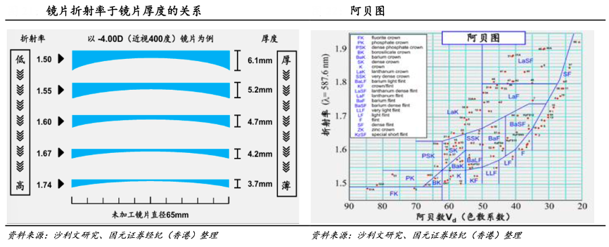 經典案例:根據沙利文研究、國元證券經紀(香港)等綜合資訊表明,對于鏡片而言,折射率反映了鏡片對光線的折射能力,同等條件下,鏡片折射率越高鏡片越輕薄,越能提高佩戴者舒適度。但由于光學原因,折射率越高會 導致鏡片色散系數(阿貝數)越大,進而導致鏡片成像不清晰,因此在制造鏡片 時,如何權衡折射率和清晰度的關系是廠商需要考慮的問題。