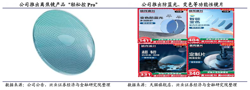 經典案例:根據公司公告、天貓旗艦店、興業證券經濟與金融研究院等綜合資訊表明,明月鏡片公司切入青少年近視防控賽道,聯合中國工程院莊松林院士團隊,于 2021 年 6 月推出青少年近視防控的一代產品“輕松控”,同年年底推出二代產品“輕松控 Pro”,分別采用周邊離焦眼軸控制技術(C.A.R.D) 及多點近視離焦眼軸控制技術(C.A.M.D),延緩青少年近視度數加深。該系列采 用公司自研的 PMC 超亮材料和 KR 樹脂材料,折射率 1.60 的近視防控產品的阿貝數高達 40,相較于外資同類的 PC 材料產品更耐磨,阿貝數、透光率等性能更優,有望享受行業高速增長紅利。