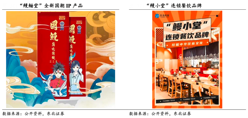 經典案例:根據公開資料、東北證券等綜合資訊表明,天馬科技公司自主打造了“鰻小堂”連鎖品牌餐飲模式,有助于貼近終端消費者、強化公司品牌形象 以及加強終端渠道的自主管控;同時公司創造了“鰻鱺堂”全新國潮 IP,借助“國貨國潮”的特征加強鰻魚這一傳統水產對 C 端年輕消費者的吸引力,產品一經登錄李佳琦直播間便取得了良 好的營銷效果。