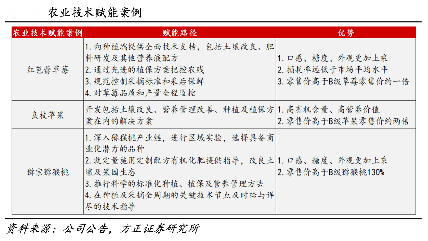 經典案例:根據公司公告、方正證券研究所等綜合資訊表明,高質量的水果品牌和產品與百果園深入上游合作密不可分。百果園通過向合作的種植基地推廣種植理念和種植與采后技術,幫助種植基地培育優質果品,提升產量。